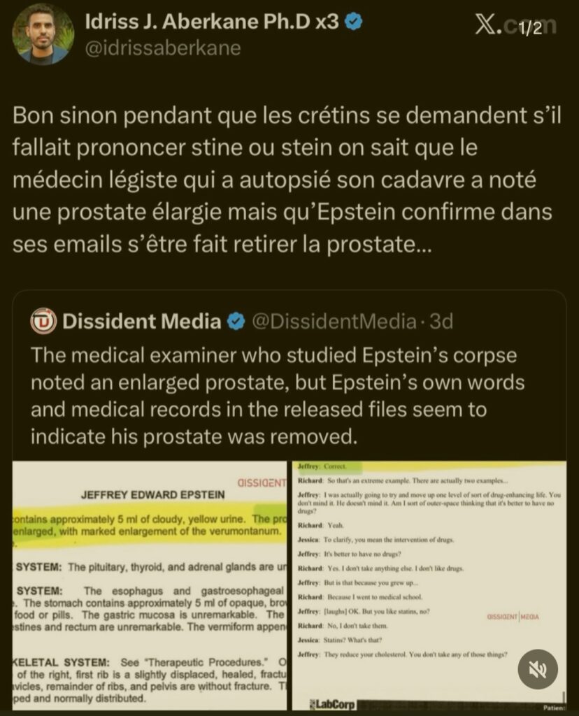 Le témoignage d’un des hommes à tout faire d’Epstein, sur la chaine Karl Zéro Absolu. Cet homme a posté ce témoignage sur « 4chan » en 2020 avant de se suicider car il ne pouvait plus vivre avec le poids de ce qu’il avait fait et vu sur la conscience. Comme le dit Karl Zéro dans sa présentation, « Un témoignage semblable aux milliers publiés par le FBI dans les dossiers Epstein, et dont les pseudo fact-checkeurs nous expliquent qu’ils sont faux. Comme ils ont expliqués que les réseaux pédocriminels liés à l’élite mondiale n’existaient pas, jusqu’à la publication des Dossiers Epstein. Ce témoignage direct vous donnera un aperçu de la réalité du réseau Epstein vu par un de ses hommes de main, et des méthodes employées pour que le silence perdure si longtemps. Il était temps que ça s’arrête. C’était pas faute de vous avoir prévenu ! »